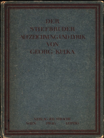 Der Stiefbruder. Aufzeichnung und Lyrik. [Erstausgabe]. Wien/Prag/Leipzig, Verlag Edition Strache, 1920. 4°. 25,5 x 19,5 cm. 73 Seiten, [2] Blatt. Original-Pappband. Erste Ausgabe. Raabe 177.1. Rot rubrizierter Text. Druck durch die Offizin Carl Fromme, Wien. Einbanddeckel mit leichteren Kratzspuren und einzelnen Tintenfleckchen, Kanten und Gelenke etwas berieben und beschabt, Rücken an den Kapitalen leicht gestaucht (Buchblock davon ebenfalls etwas betroffen), Schnitt leicht und Seiten vereinzelt minimal stockfleckig. Gutes Exemplar.