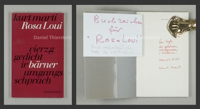 Rosa Loui. vierzg gedicht ir bärner umgangsschprach. Neuwied, Luchterhand, 1967. 8°. 58 S., 1 Bl. Originalbroschur mit transparentem Umschlag. "Edition Otto F. Walter." - Erste Ausgabe. - Mit handschriftlicher Widmung von Kurt Marti für Walter und Elisabeth Vogt "für Vogts, die getrüwen Miteidgenossen + Mitberner", datiert 25.8.1967 und einer Karte mit montiertem Zeitungsartikel, verso handschriftlich "Buchzeichen für 'Rosa Loui'.".