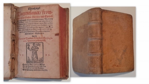 Ehrenspiegel Tugentsamer frommer Christlicher Matronen vnd Eheweiber, (darinne sie können sehen vnd lernen, Wie sie sich gegen Gott, Ihren Ehemennern vnd neben Christen verhalten sollen damit sie sich nit gegen Gott versündigen, jre Ehegemal erzürnen jren Nechsten ergern, vnd jnen selbst eine vnselige Ehe machen, nützlich zu lesen, allen liebhabern Eheliches Standes, vnd denen so gern Christlicher Eheweiber ampt versehen wollen, geschrieben durch Iohannem Rhodium Secundum, Rockhusanum, Pfarherrn zu Bischleben). Gedruckt zu Erffordt: durch Johann Beck, in Verlegung Otto von Riswick, Buchführer (Impressum hinten). 1586. Holzstiche und Initialen. unpag. ca. 300 S.. SEHR SELTEN nur in einer tschechischen Bibliothek vorhanden. 16x12cm.