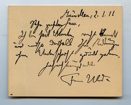 Eigenh. Briefkarte mit U. München, 2. Januar 1911. 1 S. Qu.-kl.-8vo. Im Monat vor seinem Ableben an den namentlich nicht genannten Georg Stern: ?Ich bin seit Monaten recht krank und muß deshalb Radierungen ohne Unterschrift zurück geben [...]?. ? Fritz von Uhde war Schüler von Mihály Munkácsy in Paris und widmete sich unter dem Einfluß Max Liebermanns der ?Plein-Air?-Malerei. Sein rund 285 Werke umfassendes ¼uvre umfaßt Arbeiten religiösen, geschichtlichen und mythologischen Inhalts sowie Szenen aus dem Alltagsleben und Portraits. ? Papierbedingt leicht gebräunt und mit einer vertikalen Knickfalte am linken Rand.
