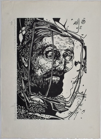 Gestörte Nature Morte in der Bilkerstrasse 14. [19]80. [Signierter Original-Holzschnitt / signed original woodcut]. _. (Bert Gerresheim, geboren am 8. Oktober 1935 in Düsseldorf, gestorben am 16.07.2025 ebenda. Studium 1956 bis 1960 an der Düsseldorfer Kunstakademie bei Otto Pankok, zusammen mit Günther Uecker und Germán Becerra. Bildhauer, Grafiker und Pädagoge). Nummer 10 von 50 nummerierten Original-Holzschnitten auf Japanpapier. Unterhalb der Abbildung von Bert Gerresheim in Blei beschriftet, datiert und signiert. Provenienz: Aus der Sammlung von Wilhelm Blasberg. Maße Blatt: 46,0 x 62,0 cm. Maße Abbildung: 32,0 x 46,0 cm. Sehr guter Zustand. Number 10 of 50 numbered original woodcuts on Japanese paper. Inscribed, dated, and signed in lead by Bert Gerresheim below the image. Provenance: From the collection of Wilhelm Blasberg. Sheet dimensions: 46.0 x 62.0 cm. Image dimensions: 32.0 x 46.0 cm. Very good condition.